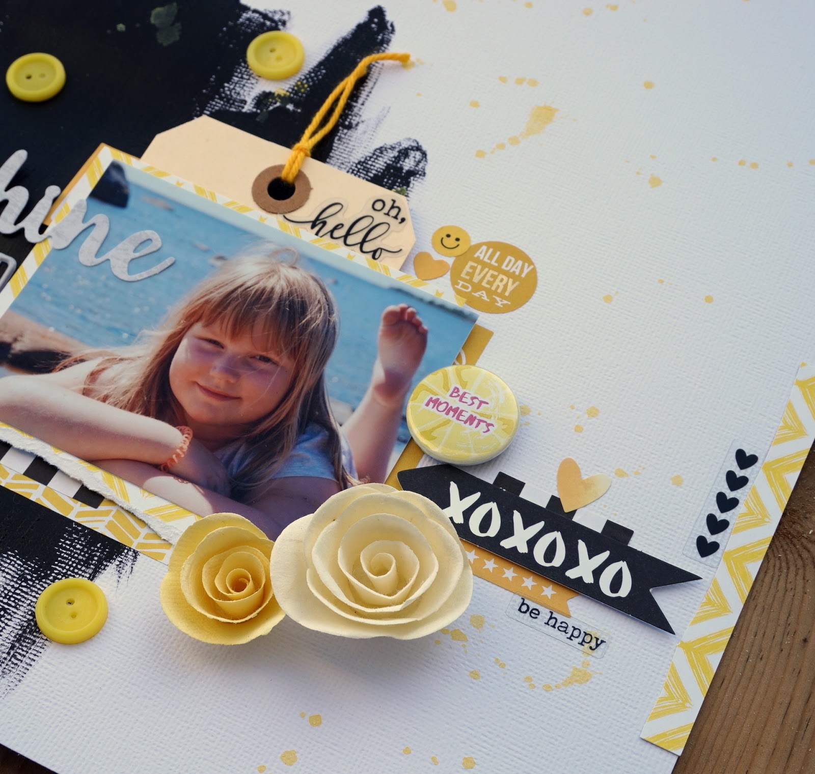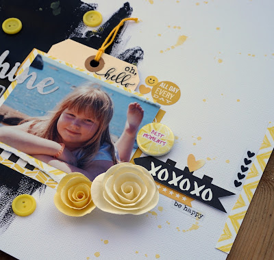 Denna månads utmaning hos More than Words, sunshine & yellow, är ganska tacksam att tolka, för det finns så många möjligheter. Speciellt efter denna soliga sommar när man har många fina foton att scrappa. Jag började med att välja ett foto, och kände för att göra en lång titel, så jag hittade ett citat som passar bra med personen på bilden. Jag målade med svart gesso, och sedan byggde jag bara på med foton, dekorationer, lite mist och rubriken. Jag ändrade mig ett par gånger angående designen, och slutresultatet blev som följer.