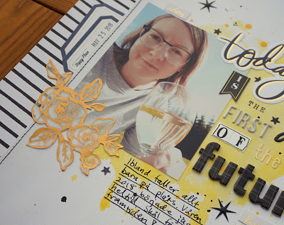Eftersom jag redigerar mina foton före jag framkallar dem så brukar jag göra dem mindre. Det har lett till att jag har svårt att scrappa lite större foton. När jag började scrappa för snart tio år sedan så var 10x15 cm foton standard för mig att scrappa, men numera så scrappar jag oftast 7,5x10 cm eller som mest 10x10 cm. Detta foto är 12,5x10 cm och det vållade förstås lite problem. Denna månads utmaning hos More than Words är Future & Stars, och detta foto passade perfekt till det temat. Selfien tog jag när jag hade skrivit kontrakt på ett nytt jobb. Jag funderade ganska länge på designen, och till sist tycker jag att jag fick det att fungera. Annars var fotot ganska lätt att jobba med, eftersom det har ganska milda färger. Jag blandade lite olika fonter som titel, och det gjorde sidan lite mer intressant, plus accentfärgen guld förstås.
